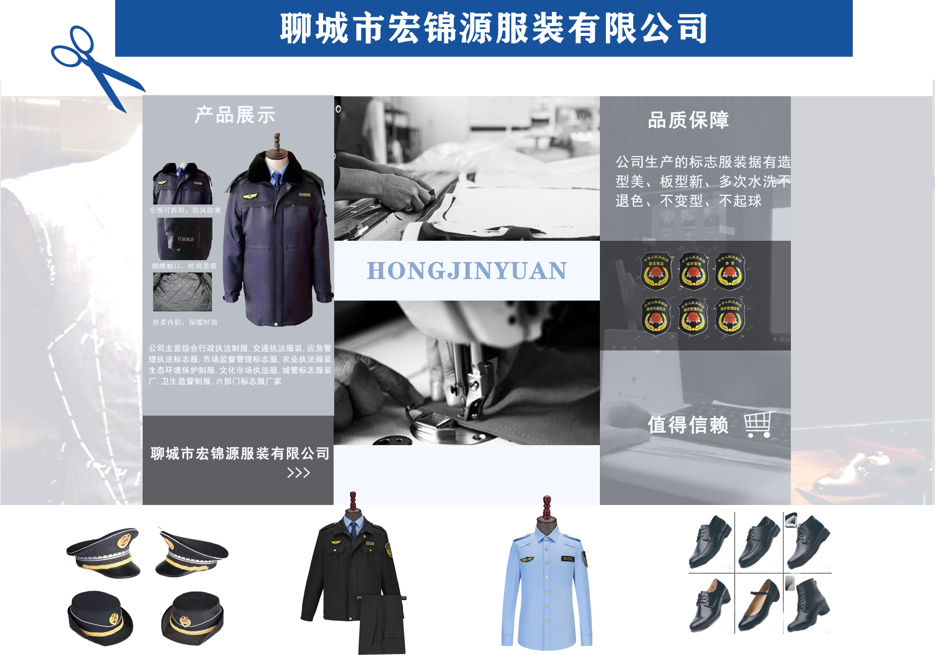 聊城市宏錦源服裝有限公司位于江北水城—山東聊城,地理位置優(yōu)越,交通便利。公司主營綜合行政執(zhí)法制服,交通執(zhí)法服裝,應急管理執(zhí)法標志服,市場監(jiān)督管理標志服,農(nóng)業(yè)執(zhí)法服裝,生態(tài)環(huán)境保護制服,文化市場執(zhí)法服,城管標志服裝廠,衛(wèi)生監(jiān)督制服,六部門標志服廠家等,值得信賴! 公司生產(chǎn)的標志服裝據(jù)有造型美、板型新、多次水洗不退色、不變型、不起泡?! 罢J真辦事,踏實做人”是宏錦源的企業(yè)精神,我們的宗旨是:“用服務與真誠來換取你的信任與支持,互惠互利,共創(chuàng)雙贏!”我公司愿與國內(nèi)外各界同仁志士竭誠合作,共創(chuàng)未來企業(yè)目標:在已選定的服飾領域中,成為行業(yè)的卓越者。 經(jīng)營理念:追求產(chǎn)品卓越,為用戶提供完美、高效的服務。...